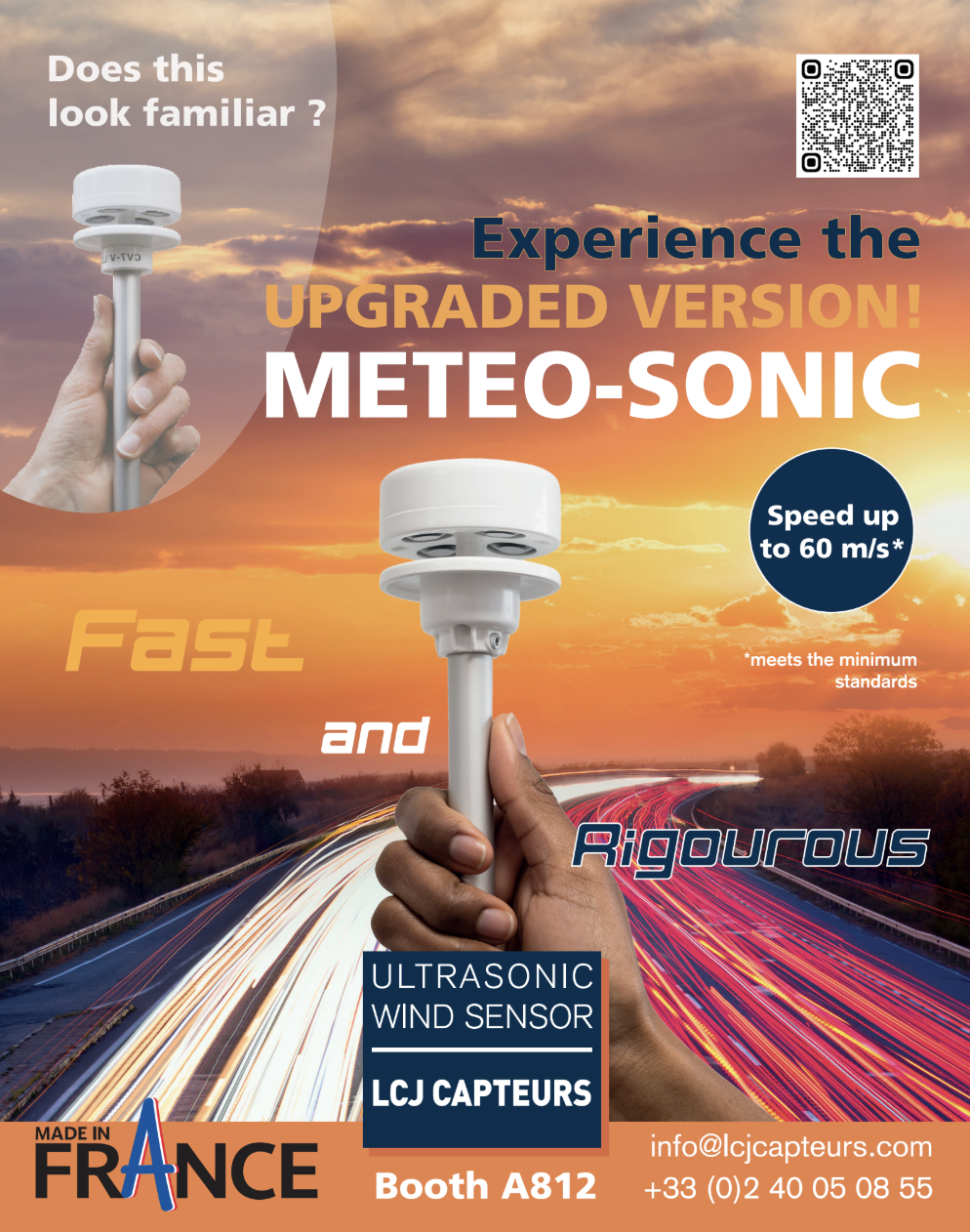 Cette année l’équipe LCJ Capteurs était impatiente d’honorer sa participation annuelle à ce rendez-vous incontournable et international des professionnels de la météorologie. En effet, c’était l’occasion parfaite pour présenter en avant-première sa toute dernière innovation, le METEO-SONIC. En quelques mots, il s’agit d’un capteur de vent ultrasonique répondant aux normes météo, capable de mesurer la vitesse du vent jusqu’à 60 m/s. Et donc une avancée majeure qui permet de s’inscrire parmi les plus grands. Pendant ce salon viennois, les clients et prospects de LCJ Capteurs ont montré un réel intérêt. Ils étaient également ravis de pouvoir assister aux premières démonstrations de ce nouveau capteur. Une proposition qui a enfin permis de donner la réponse tant attendue à la question récurrente annuelle « Jusqu’à combien vos capteurs peuvent-ils mesurer la vitesse du vent ? ». Et ce fut une joie et une réelle fierté pour l’équipe de LCJ Capteurs et son bureau d’études de répondre, jusqu’à 60m/s. Car c’est là le point fondamental pour les professionnels du secteur. On parle donc ici d’une technologie très attendue, dont la sortie officielle est prévue en 2026.